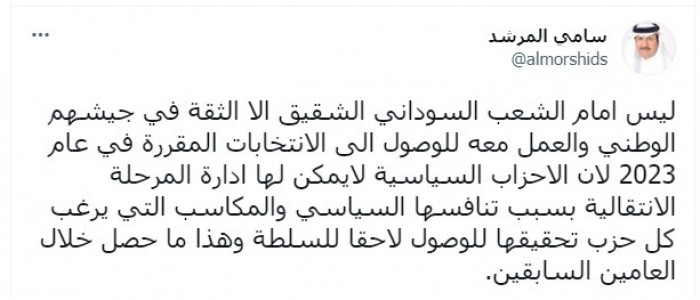 دعا المحلل السياسي السعودي سامي المرشد، الشعب السوداني، بالوقوف مع الجيش والعمل معه، كونه المؤسسة الوحيدة القادرة على قيادة المرحلة الانتقالية حتى الوصول للانتخابات الرئاسية.