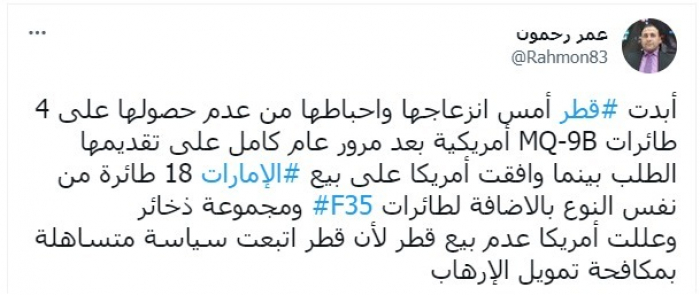 وبيّن في تغريدة عبر "تويتر"، اليوم: "قطر أبدت أمس انزعاجها وإحباطها من عدم حصولها على 4 طائرات MQ-9B أمريكية بعد مرور عام كامل على تقديمها الطلب".