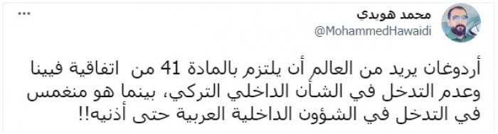 وكتب في تغريدة عبر "تويتر"، اليوم: "أردوغان يريد من العالم أن يلتزم بالمادة 41 من اتفاقية فيينا وعدم التدخل في الشأن الداخلي التركي بينما هو منغمس في التدخل في الشؤون الداخلية العربية حتى أذنيه".