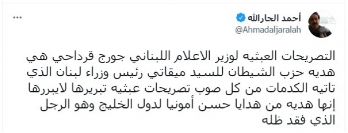 الجارالله عن تصريحات قرداحي: هدية حزب الله لـ ميقاتي