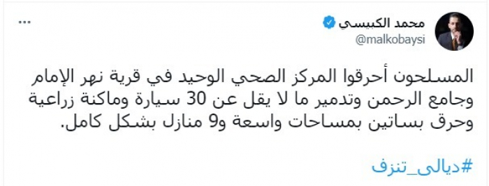 وتابع: "وحرق بساتين بمساحات واسعة و9 منازل بشكل كامل"، مختتما تغريدته بهاشتاج: "ديالي تنزف".