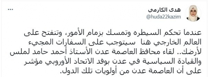 ولفتت إلى: "لقاء محافظ العاصمة عدن أحمد حامد لملس والقيادة السياسية في عدن بوفد الاتحاد الأوروبي"، مشددة على أن هذا اللقاء: "مؤشر على أن العاصمة عدن من أولويات تلك الدول".