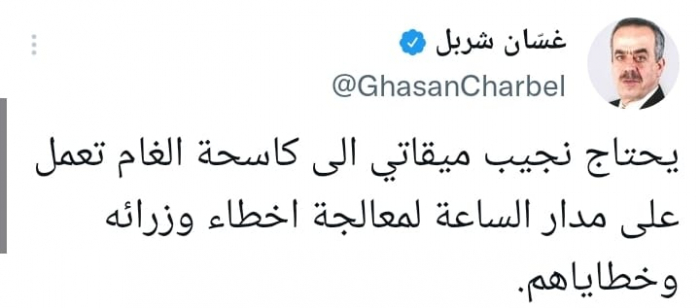 وأكد في تغريدة على حسابه بموقع التدوين المصغر تويتر، اليوم أنه: "يحتاج نجيب ميقاتي إلى كاسحة ألغام تعمل على مدار الساعة لمعالجة أخطاء وزرائه وخطاياهم".