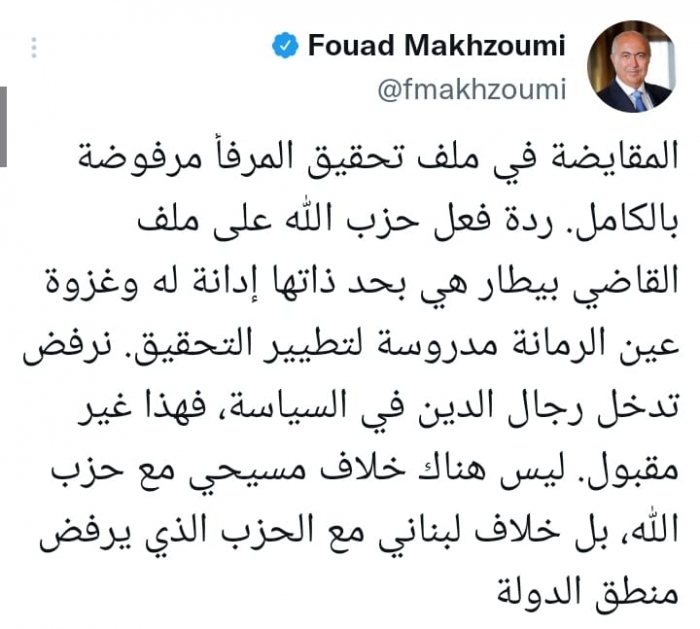 وأكد في تغريدة على حسابه بموقع التدوين المصغر تويتر، اليوم أن: "المقايضة في ملف تحقيق المرفأ مرفوضة بالكامل".
