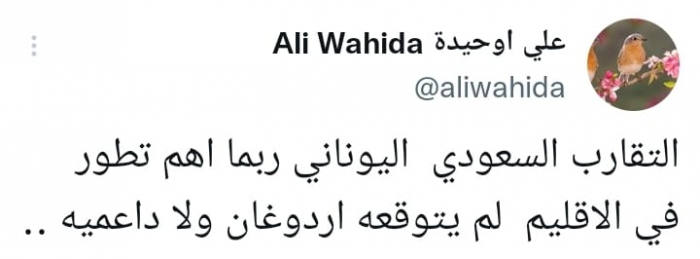 وكتب في تغريدة على حسابه بموقع التدوين المصغر تويتر، اليوم: "التقارب السعودي اليوناني ربما أهم تطور في الإقليم لم يتوقعه أردوغان ولا داعميه".
