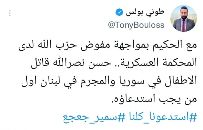 وأكد أن: "حسن نصرالله قاتل الأطفال في سوريا والمجرم في لبنان أول من يجب استدعاؤه"، مختتما بهاشتاج: "استدعونا كلنا وسمير جعجع".