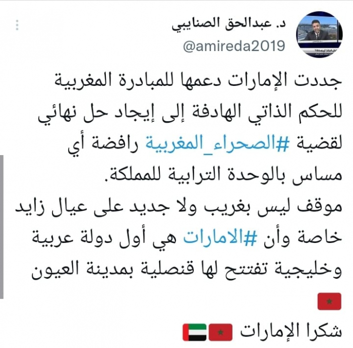 الصنايبي مشيدا بالإمارات: لا تقبل المساس بوحدة المغرب