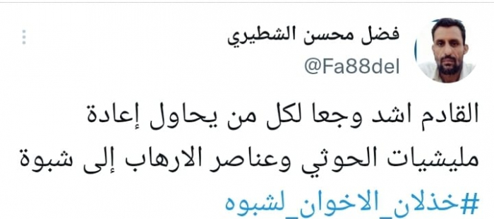 وقال في تغريدة على حسابه بموقع التدوين المصغر تويتر، اليوم إن: "القادم أشد وجعا لكل من يحاول إعادة مليشيات الحوثي وعناصر الإرهاب إلى شبوة"، مختتما بهاشتاج: "خذلان الإخوان لشبوة".