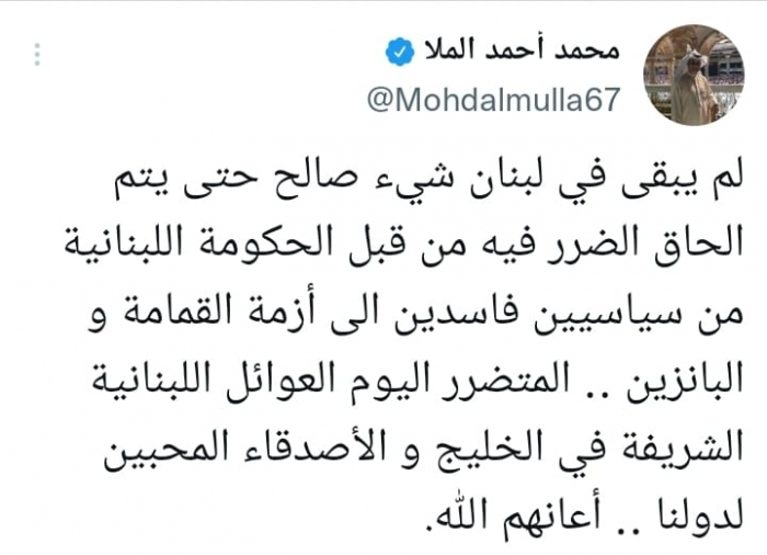وأشار إلى أن: "المتضرر اليوم العوائل اللبنانية الشريفة في الخليج والأصدقاء المحبين لدولنا.. أعانهم الله".