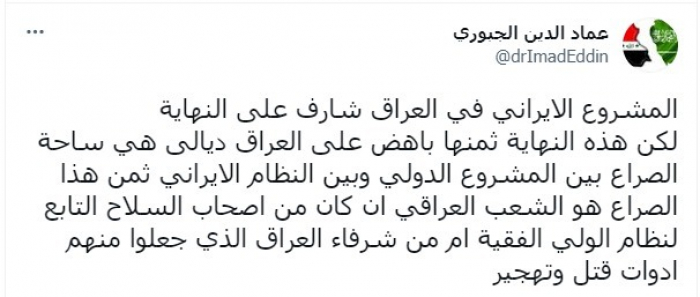 وكتب في تغريدة عبر "تويتر"، اليوم: "المشروع الإيراني في العراق شارف على النهاية لكن هذه النهاية ثمنها باهض على العراق".