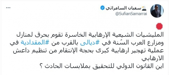 استنكر الإعلامي العراقي سفيان السامرائي، جرائم مليشيات إيران بحق المواطنين من حرق منازلهم وتهجيرهم بمحافظة ديالى.