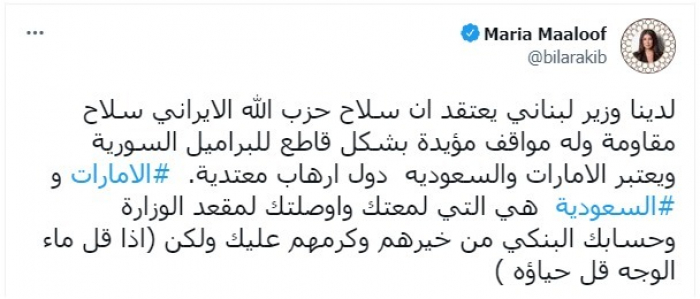 وأشارت إليه في تغريدة عبر "تويتر"، اليوم: "لدينا وزير لبناني يعتقد أن سلاح حزب الله الإيراني سلاح مقاومة وله مواقف مؤيدة بشكل قاطع للبراميل السورية ويعتبر الإمارات والسعودية دول معتدية".