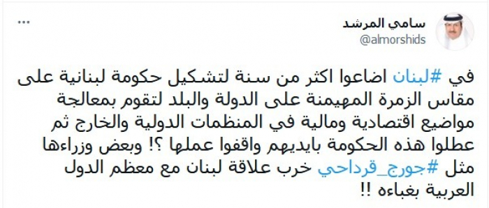 أكد المحلل السياسي السعودي سامي المرشد، أن وزير الإعلام اللبناني المدعو جورج قرداحي، دمر علاقة لبنان بمعظم الدول العربية بغبائه، بعد إضاعة أكثر من سنة لتشكيل حكومة لمعالجة الأوضاع.