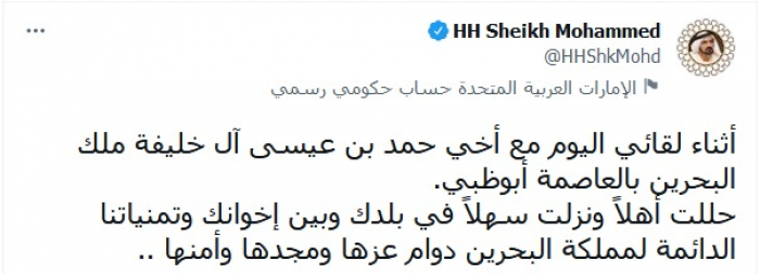 ونشر في تغريدة عبر "تويتر"، صورا من اللقاء، معلقا عليها: "حللت أهلا ونزلت سهلا في بلدك وبين إخوانك وتمنياتنا الدائمة لمملكة البحرين دوام عزها ومجدها وأمنها".