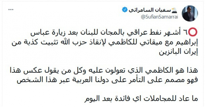 هاجم الإعلامي العراقي سفيان السامرائي، رئيس الوزراء العراقي مصطفى الكاظمي، بعد تصديره النفط للبنان مجانا، لإنقاذ مليشيا حزب الله.