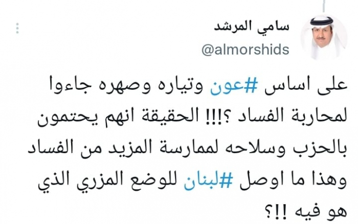 وتساءل في تغريدة على حسابه بموقع التدوين المصغر تويتر، اليوم: "على أساس عون وتياره وصهره جاءوا لمحاربة الفساد؟".