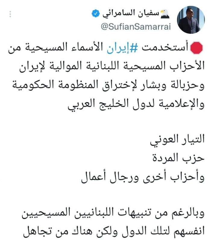 وأشار في تغريدة على حسابه بموقع التدوين المصغر تويتر، اليوم إلى أنه: "استخدمت إيران الأسماء المسيحية من الأحزاب المسيحية اللبنانية الموالية لإيران وحزبالة وبشار لاختراق المنظومة الحكومية والإعلامية لدول الخليج العربي".