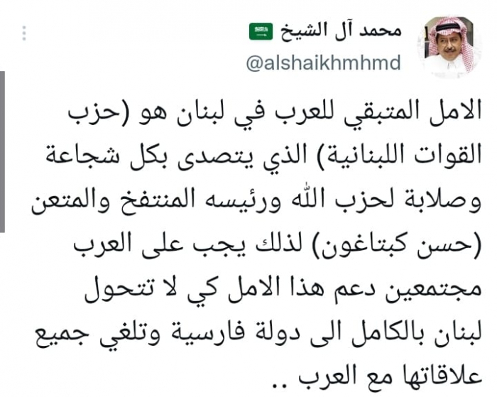 اعتبر الكاتب الصحفي محمد آل الشيخ، أن حزب القوات اللبنانية، أخر أمل للعرب في إنقاذ لبنان من التحول إلى دولة فارسية.