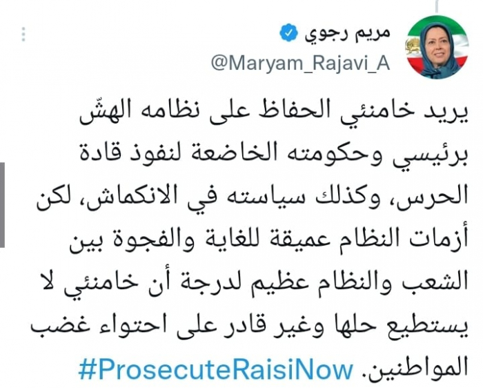 وأوضحت في تغريدة على حسابها بموقع التدوين المصغر تويتر، اليوم أنه: "يريد خامنئي الحفاظ على نظامه الهشّ برئيسي وحكومته الخاضعة لنفوذ قادة الحرس، وكذلك سياسته في الانكماش".