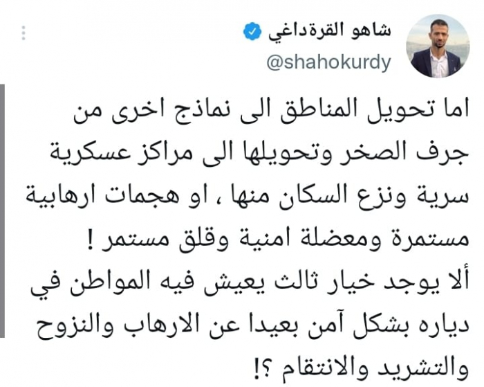 هاجم الكاتب الصحفي شاهو قرة داغي، منهج المليشيات العراقية الموالية لإيران في تهجير السكان واستهدافهم بهجمات إرهابية، وترويعهم.