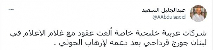 أشاد الإعلامي السوري عبدالجليل السعيد، بقرار بعض الشركات الخليجية الخاصة، بإلغاء تعاقدها مع المدعو جورج قرداحي، على خلفية تصريحاته الأخيرة الداعمة لإرهاب مليشيا الحوثي.