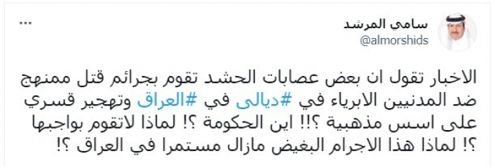 هاجم المحلل السياسي السعودي سامي المرشد، الحكومة العراقية، بعد جرائم مليشيا الحشد الشعبي بحق العراقيين في ديالى.