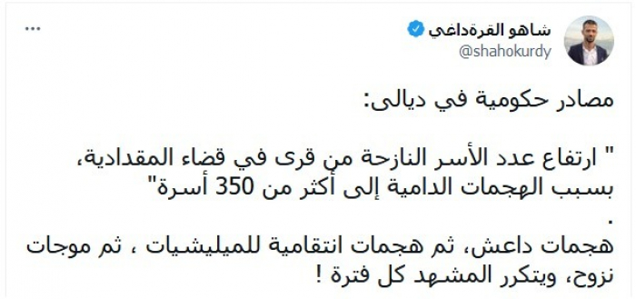 واستند في تغريدة عبر "تويتر"، اليوم، إلى ما أعلنته مصادر حكومية بديالى: "ارتفاع عدد الأسر النازحة من قرى في قضاء المقدادية، بسبب الهجمات الدامية إلى أكثر من 350 أسرة".