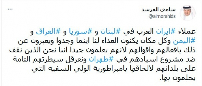 وذكر في تغريدة عبر "تويتر"، اليوم: "عملاء إيران العرب في لبنان وسوريا والعراق واليمن وكل مكان يكنون العداء لنا أينما وجدوا ويعبرون عن ذلك بأفعالهم وأقوالهم".