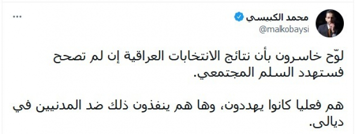 وأشار في تغريدة عبر "تويتر"، اليوم: "لوّح خاسرون بأن نتائج الانتخابات العراقية إن لم تصحح فستهدد السلم المجتمعي".