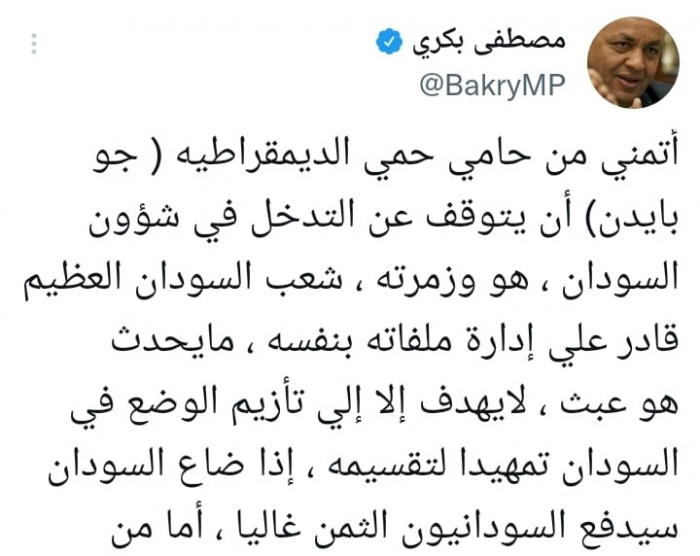 وكتب في تغريدة على حسابه بموقع التدوين المصغر تويتر، اليوم: "أتمني من حامي حمي الديمقراطية (جو بايدن) أن يتوقف عن التدخل في شؤون السودان ، هو وزمرته".