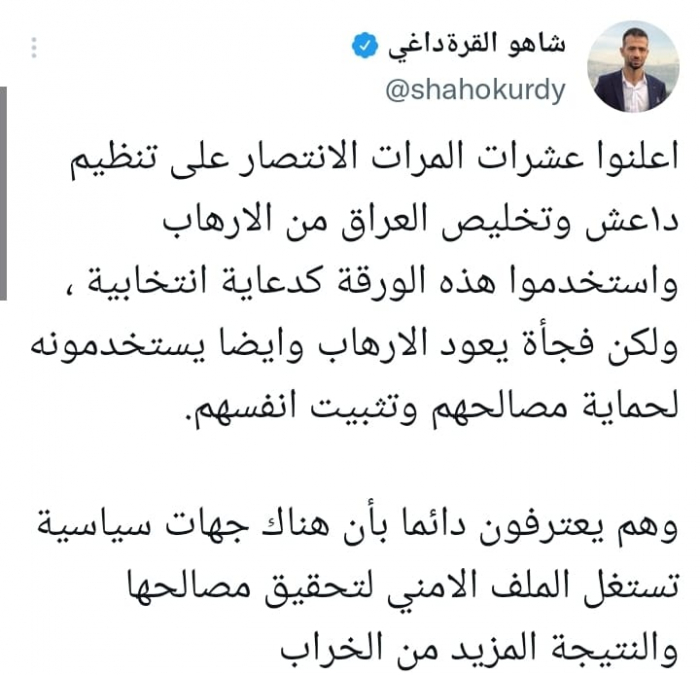 وأشار في تغريدة على حسابه بموقع التدوين المصغر تويتر، اليوم إلى أنهم: "أعلنوا عشرات المرات الانتصار على تنظيم داعش وتخليص العراق من الإرهاب واستخدموا هذه الورقة كدعاية انتخابية".