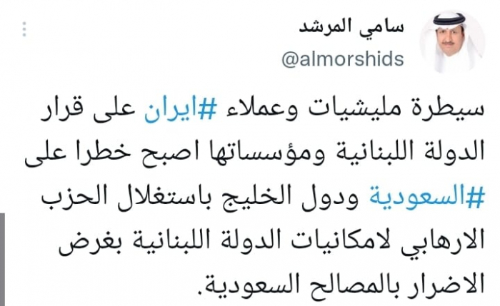 وأشار في تغريدة على حسابه بموقع التدوين المصغر تويتر، اليوم إلى أن: "سيطرة مليشيات وعملاء إيران على قرار الدولة اللبنانية ومؤسساتها أصبح خطرا على السعودية ودول الخليج".