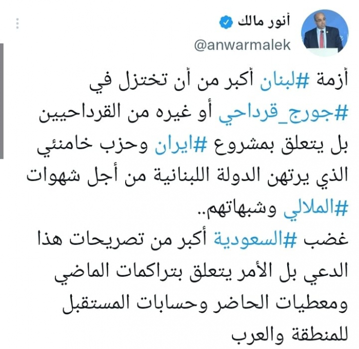 اعتبر الكاتب والباحث السياسي أنور مالك، أن الأزمة الخليجية اللبنانية تتعدى تصريحات وزير الإعلام اللبناني المسيئة، مضيفا أن هناك تراكمات نابعة من مواقف مليشيات حزب الله الموالي لإيران.
