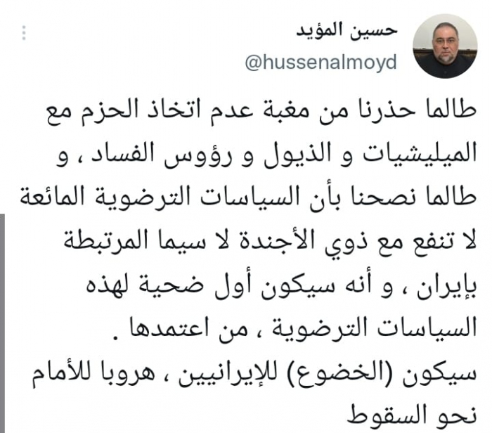 رفض الناشط السياسي حسين المؤيد، انتهاج الحكومة العراقية سياسة ترضية المليشيات الموالية لنظام ملالي طهران، موضحا أنها غير مفيدة مع أصحاب الأجندات الخارجية.