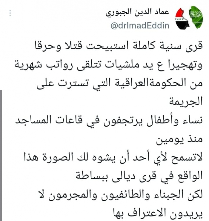 وشدد في تغريدة على حسابه بموقع التدوين المصغر تويتر، اليوم على أن هناك: "قرى سنية كاملة استبيحت قتلا وحرقا وتهجيرا على يد مليشيات تتلقى رواتب شهرية من الحكومة العراقية التي تسترت على الجريمة".