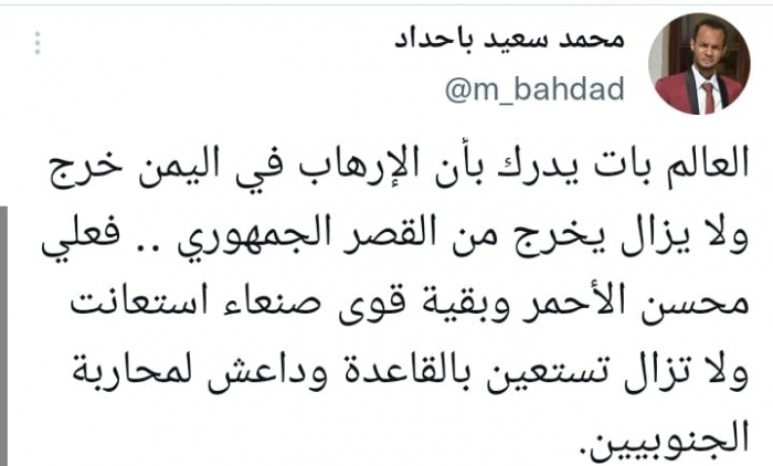 باحداد: الإرهاب في الجنوب يأتي من القصر الجمهوري اليمني