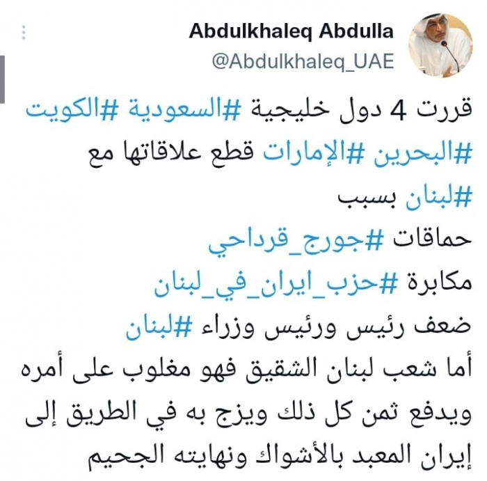وِأشار في تغريدة على حسابه بموقع التدوين المصغر تويتر، اليوم إلى أنه: "قررت 4 دول خليجية السعودية والكويت والبحرين والإمارات قطع علاقاتها مع لبنان".