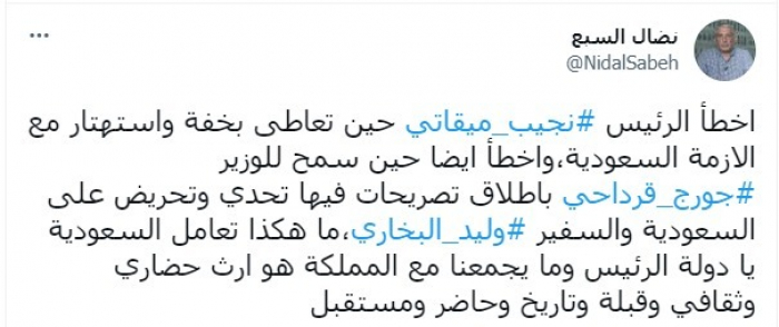 أكد المحلل السياسي اللبناني نضال السبع، أن رئيس الحكومة اللبنانية نجيب ميقاتي، أخطأ مرتين في التعامل مع الأزمة السعودية.