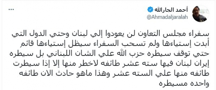 وأوضح: "سفراء مجلس التعاون لن يعودوا إلى لبنان وحتى الدول التي أبدت استياءها ولم تسحب السفراء سيظل استياؤها قائما حتى توقف سيطرة حزب الله على الشأن اللبناني بل سيطرة إيران".
