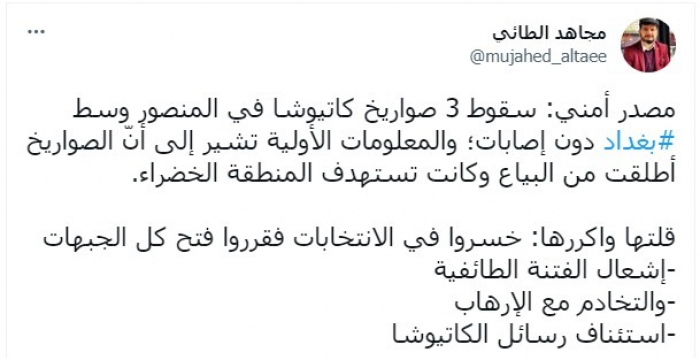 وأشار إلى ما أعلنه مصدر أمني بشأن: "سقوط 3 صواريخ كاتيوشا في المنصور وسط بغداد دون إصابات؛ والمعلومات الأولية تشير إلى أنّ الصواريخ أطلقت من البياع وكانت تستهدف المنطقة الخضراء".
