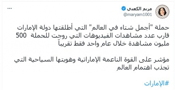 تحدثت الكاتبة الصحفية الإماراتية مريم الكعبي، عن حملة "أجمل شتاء في العالم"، التي أطلقتها دولة الإمارات، في ديسمبر من العام الماضي.