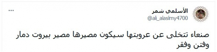 وكتب في تغريدة عبر "تويتر"، اليوم: "صنعاء تتخلى عن عروبتها سيكون مصيرها مصير بيروت دمار وفتن وفقر".