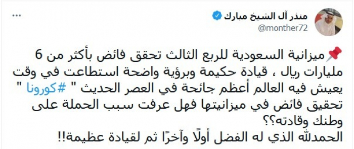 واعتبر أن هذا الفائض بفضل: "قيادة حكيمة وبرؤية واضحة استطاعت في وقت يعيش فيه العالم أعظم جائحة في العصر الحديث (كورونا) تحقيق فائض في ميزانيتها".