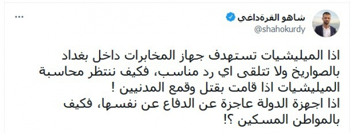 هاجم الكاتب الصحفي العراقي شاهو القرة داغي، أجهزة الدولة في العراق، بعد عجزها عن الرد أمام مليشيات إيران عقب استهدافها لجهاز المخابرات بالصواريخ في بغداد.