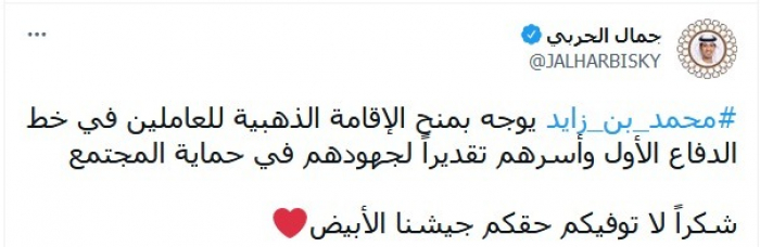 وكتب في تغريدة عبر "تويتر"، اليوم: "محمد بن زايد يوجه بمنح الإقامة الذهبية للعاملين في خط الدفاع الأول وأسرهم تقديرا لجهودهم في حماية المجتمع".