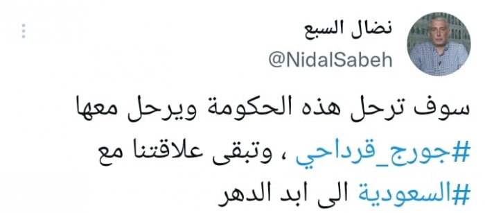 وكتب في تغريدة على حسابه بموقع التدوين المصغر تويتر، اليوم: "سوف ترحل هذه الحكومة ويرحل معها جورج قرداحي، وتبقى علاقتنا مع السعودية إلى أبد الدهر".