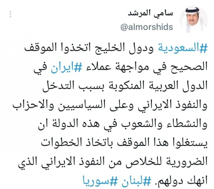 وشدد في تغريدة على حسابه بموقع التدوين المصغر تويتر، اليوم على أن: "السعودية ودول الخليج اتخذوا الموقف الصحيح في مواجهة عملاء إيران في الدول العربية المنكوبة بسبب التدخل والنفوذ الإيراني".
