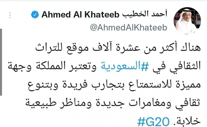 وأكد في تغريدة على حسابه بموقع التدوين المصغر تويتر، اليوم أن: "هناك أكثر من عشرة آلاف موقع للتراث الثقافي في السعودية وتعتبر المملكة وجهة مميزة للاستمتاع بتجارب فريدة وبتنوع ثقافي ومغامرات جديدة ومناظر طبيعية خلابة".