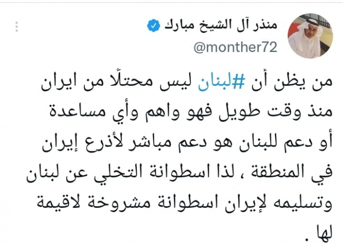 رأى المدون السعودي منذر آل الشيخ أن دولة لبنان تحت احتلال نظام ملالي طهران عن طريق ذراعها مليشيا حزب الله.