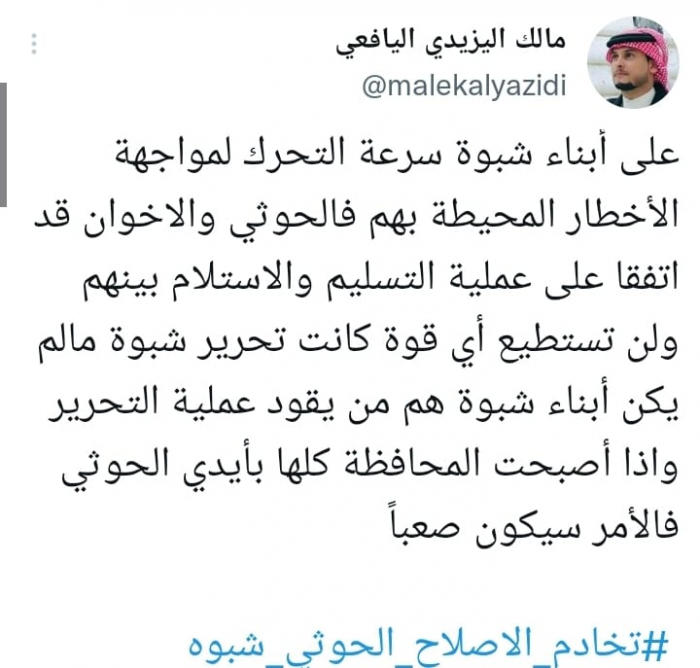وأكد في تغريدة على حسابه بموقع التدوين المصغر تويتر، اليوم أنه: "على أبناء شبوة سرعة التحرك لمواجهة الأخطار المحيطة بهم فالحوثي والإخوان قد اتفقا على عملية التسليم والاستلام بينهم".
